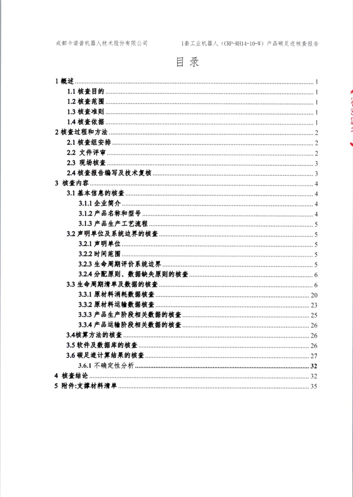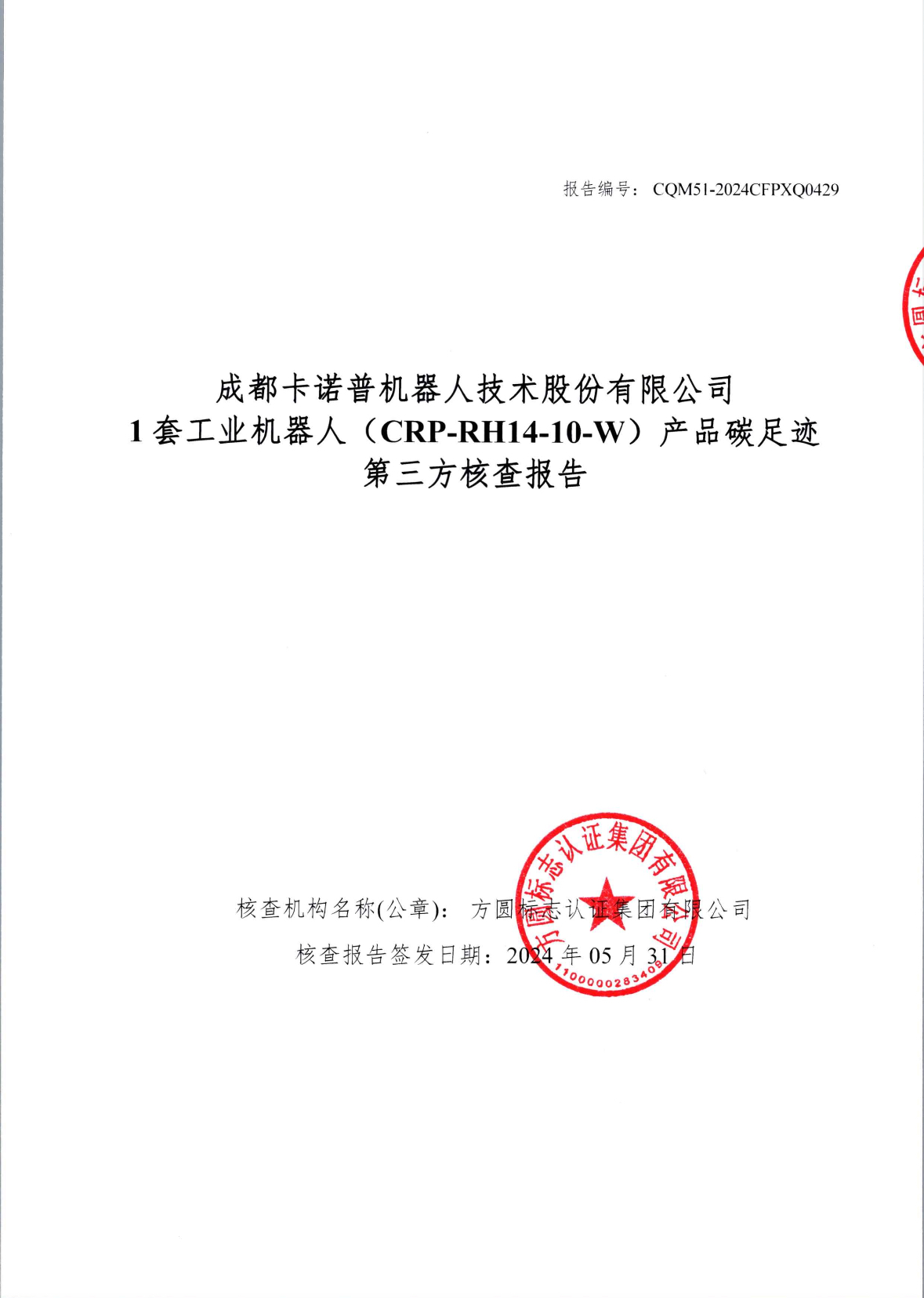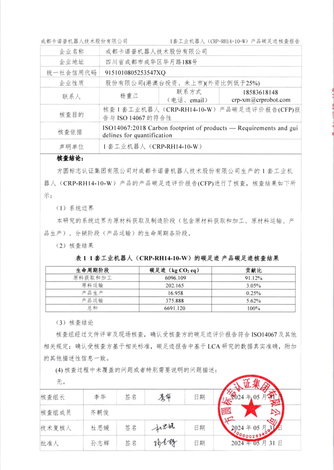 成都星空电竞机器人技术股份有限公司1套工业机器人(CRP-RH14-10-W)产品碳足迹第三方核查报告